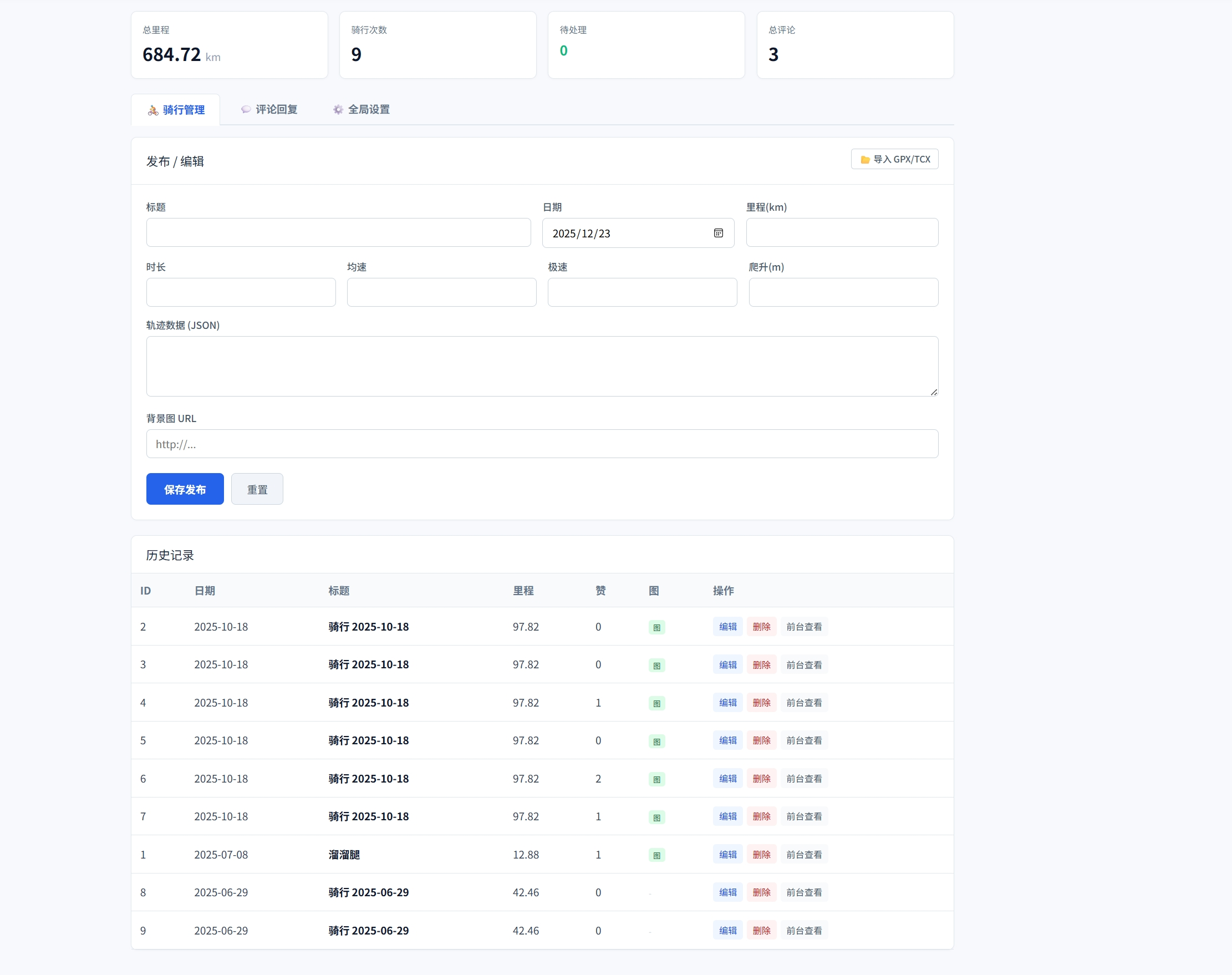 便捷上传:后台支持拖拽或点击上传文件,自动填充表单数据,发布骑行记录就像发博客一样简单。