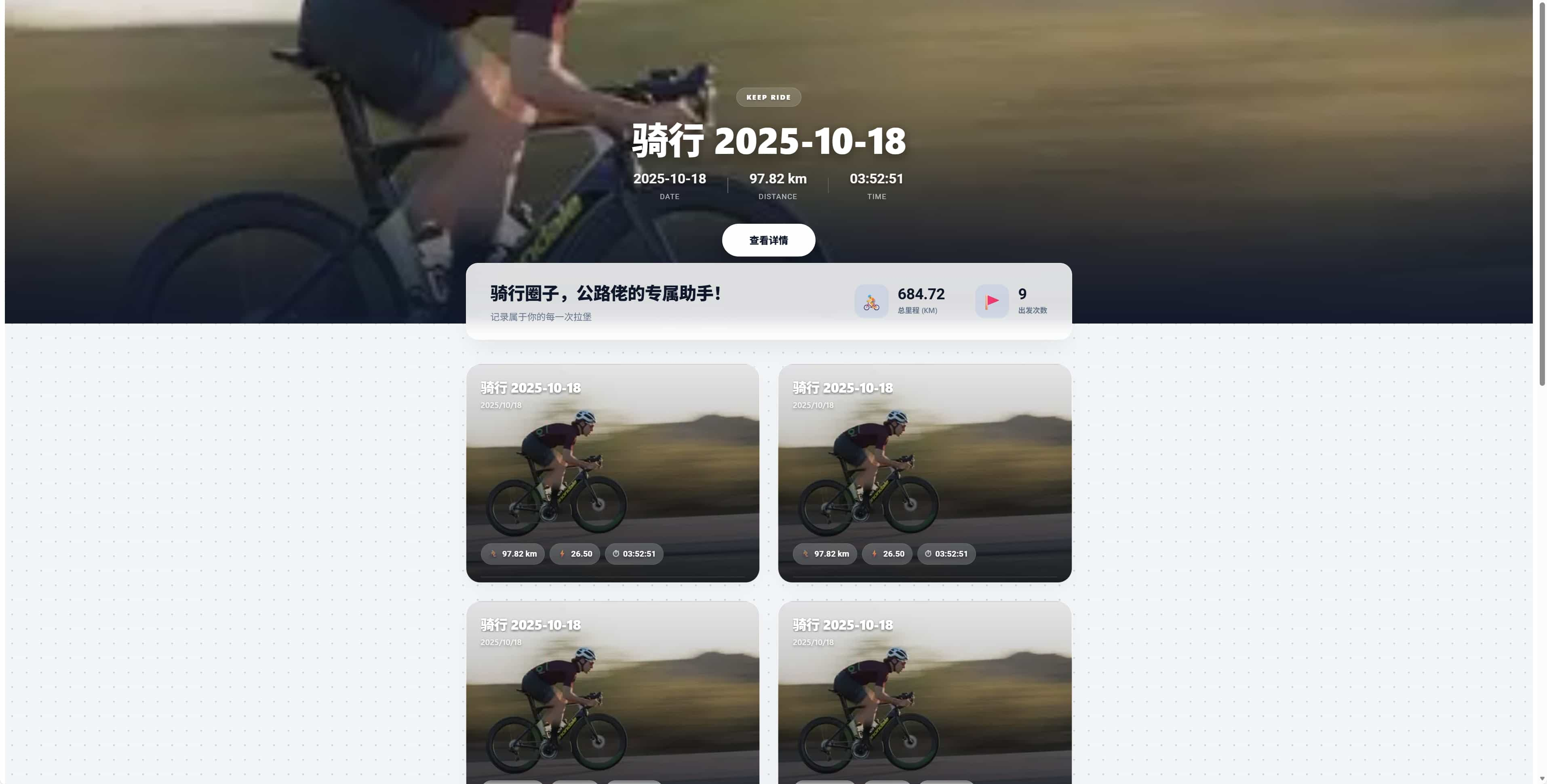 极简胶囊卡片:骑行列表摒弃了繁杂的表格,采用现代化的卡片布局。关键数据(里程、均速、时长)封装在半透明的 “胶囊” 中,既清晰易读又不遮挡背景美图。