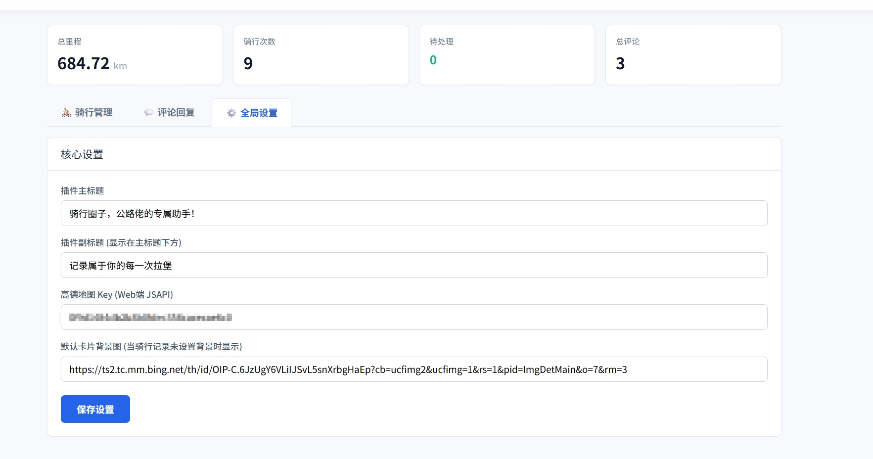 全局配置:可自定义插件的主标题、副标题以及地图 API Key,打造专属的骑行主页。