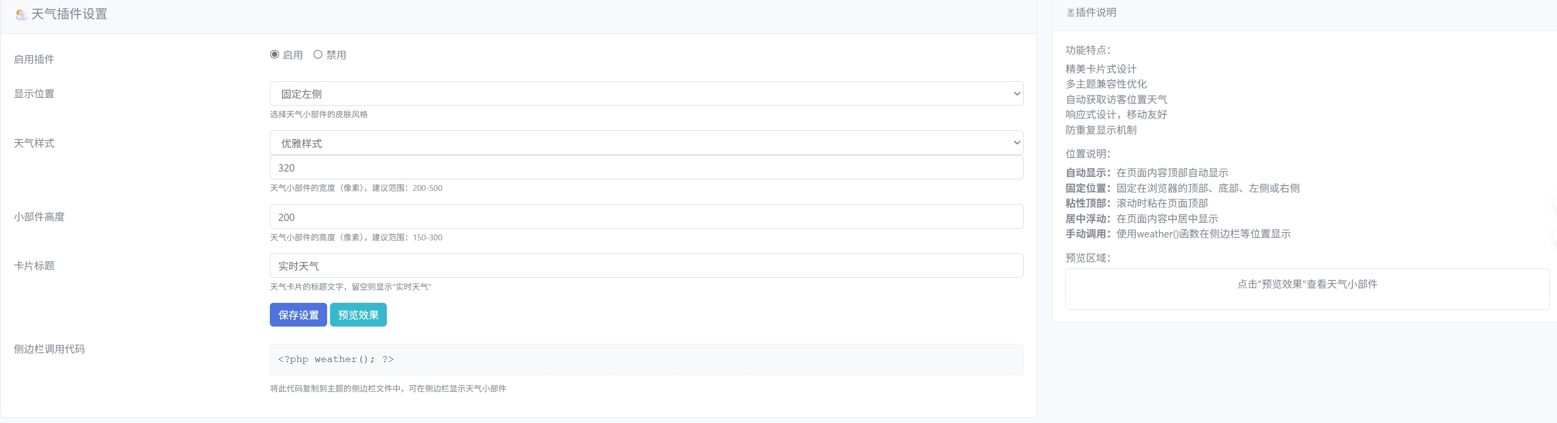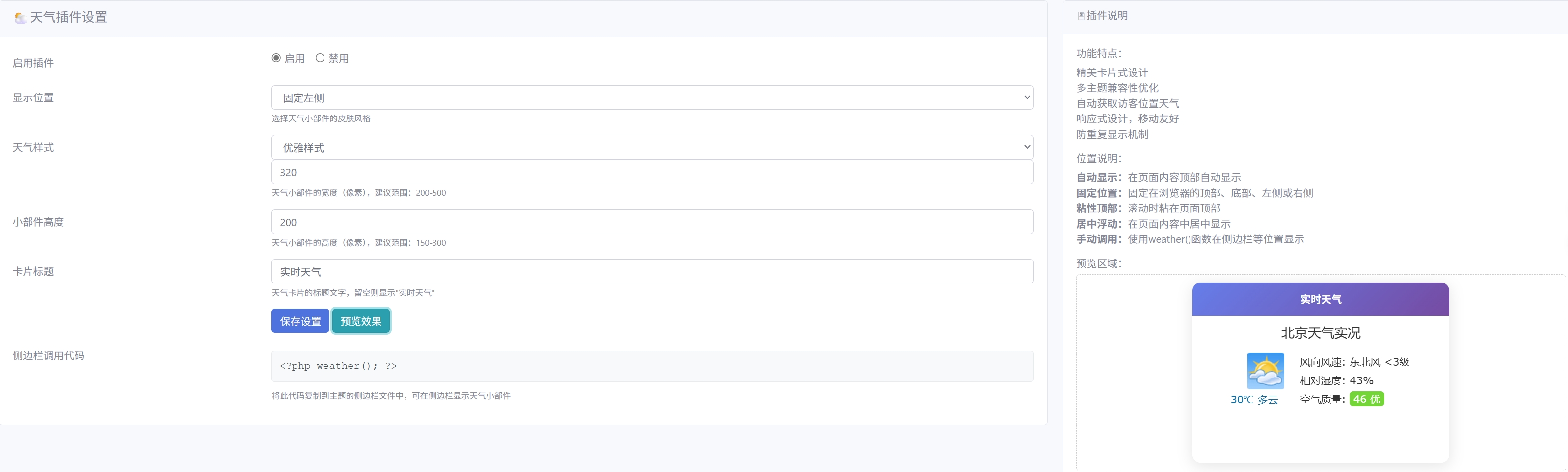自适应位置天气小部件,支持多种固定位置和侧边栏调用。